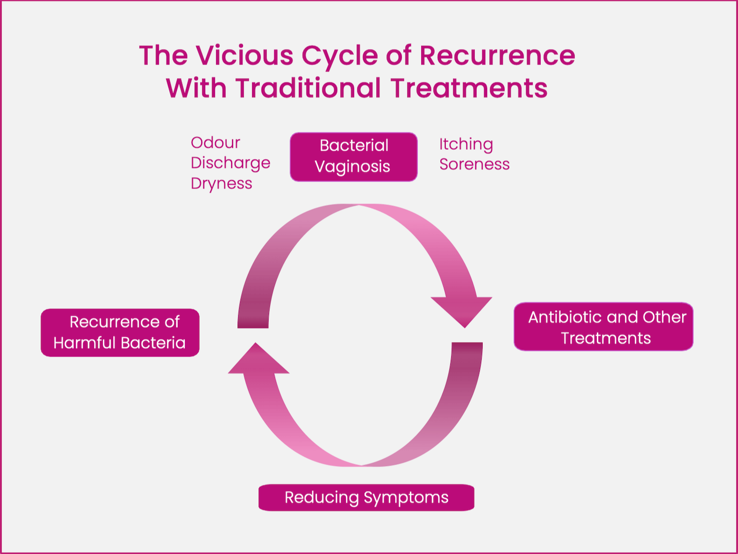 Traditional treatments such as antibiotics and antifungals only address symptoms by killing harmful bacteria, but do not restore beneficial bacteria or pH levels. This results in reinfection and a vicious cycle of repeated treatment.